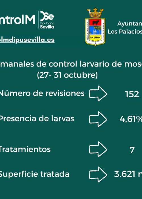 Últimos datos actualizados de control larvario de mosquitos en Los Palacios y Villafranca, semana del 20 al 24 de octubre de 2025. -Número de revisiones: 152 -Presencia de Larvas: 4,61% -Tratamientos: 7 -Superficie tratada: 3.621 m2