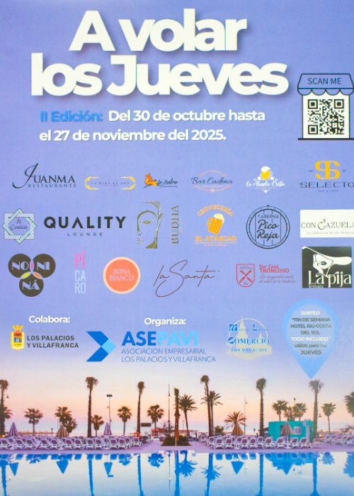 La Asociación de Empresarios de Los Palacios y Villafranca (ASEPAVI), en colaboración con el Ayuntamiento, ha presentado la segunda edición de la iniciativa gastronómica “A volar los jueves”, una propuesta que invita a vecinos y visitantes a disfrutar de la oferta hostelera local y optar a un atractivo premio.