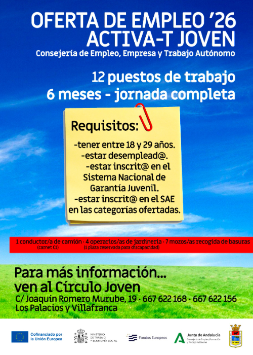El Ayuntamiento de Los Palacios y Villafranca pondrá en marcha el programa Activa-T Joven, una iniciativa destinada a fomentar la inserción laboral de personas jóvenes desempleadas del municipio. El proyecto permitirá la contratación durante seis meses, a jornada completa, de doce jóvenes, gracias a una inversión total de 180.000 euros.