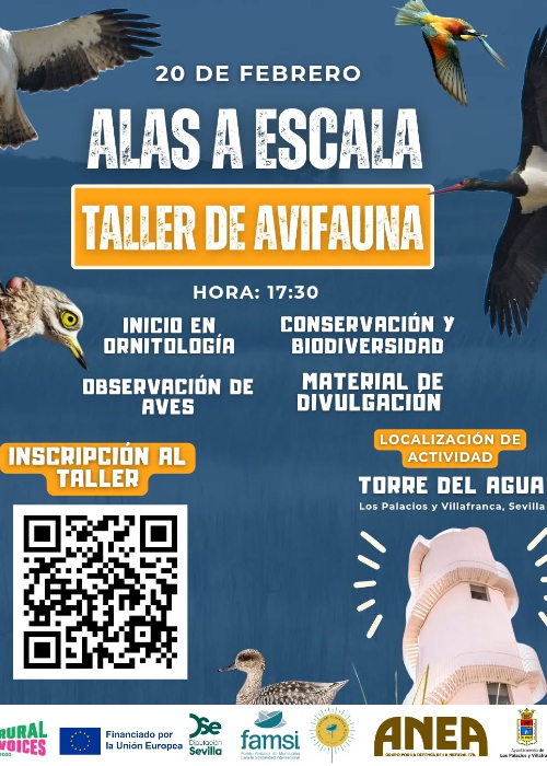 Desde hoy mismo el Grupo Ecologista ANEA en colaboración con el Ayuntamiento de Los Palacios y Villafranca desarrolla el taller formativo “Alas a Escala”, una propuesta para iniciarse en la ornitología y la observación de aves a través de una experiencia educativa única que acoge la Torre del Agua mirador Atalaya de la Marisma.