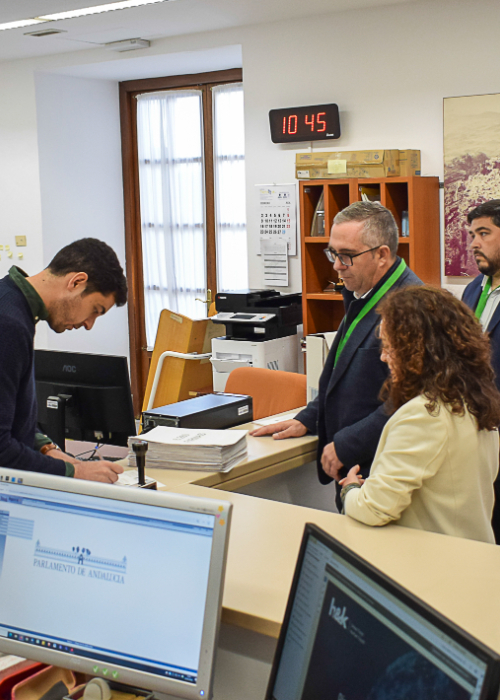 El alcalde de Los Palacios y Villafranca, Juan Manuel Valle, acompañado del delegado municipal de Educación, Florián Ramírez, y Rafael González, en representación de las AMPAs de la localidad, ha registrado hoy en el Parlamento andaluz más de 6.000 firmas para reclamar a la Junta de Andalucía el cumplimiento de los compromisos adquiridos en materia de infraestructuras educativas en el municipio.