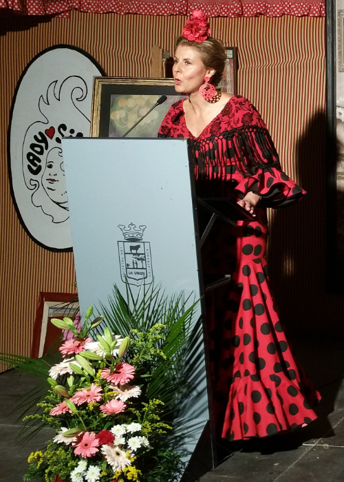 La pregonera, Inmaculada Begines Palma, resaltó en su pregón las ferias vividas en su niñez, con sus padres, en la caseta amiga de la Lady, Lord Curro, y tuvo también un emotivo pasaje dedicado a la Virgen de las Nieves. Pin de Oro 2017 de Cafer para Santiago Sánchez Muñoz.